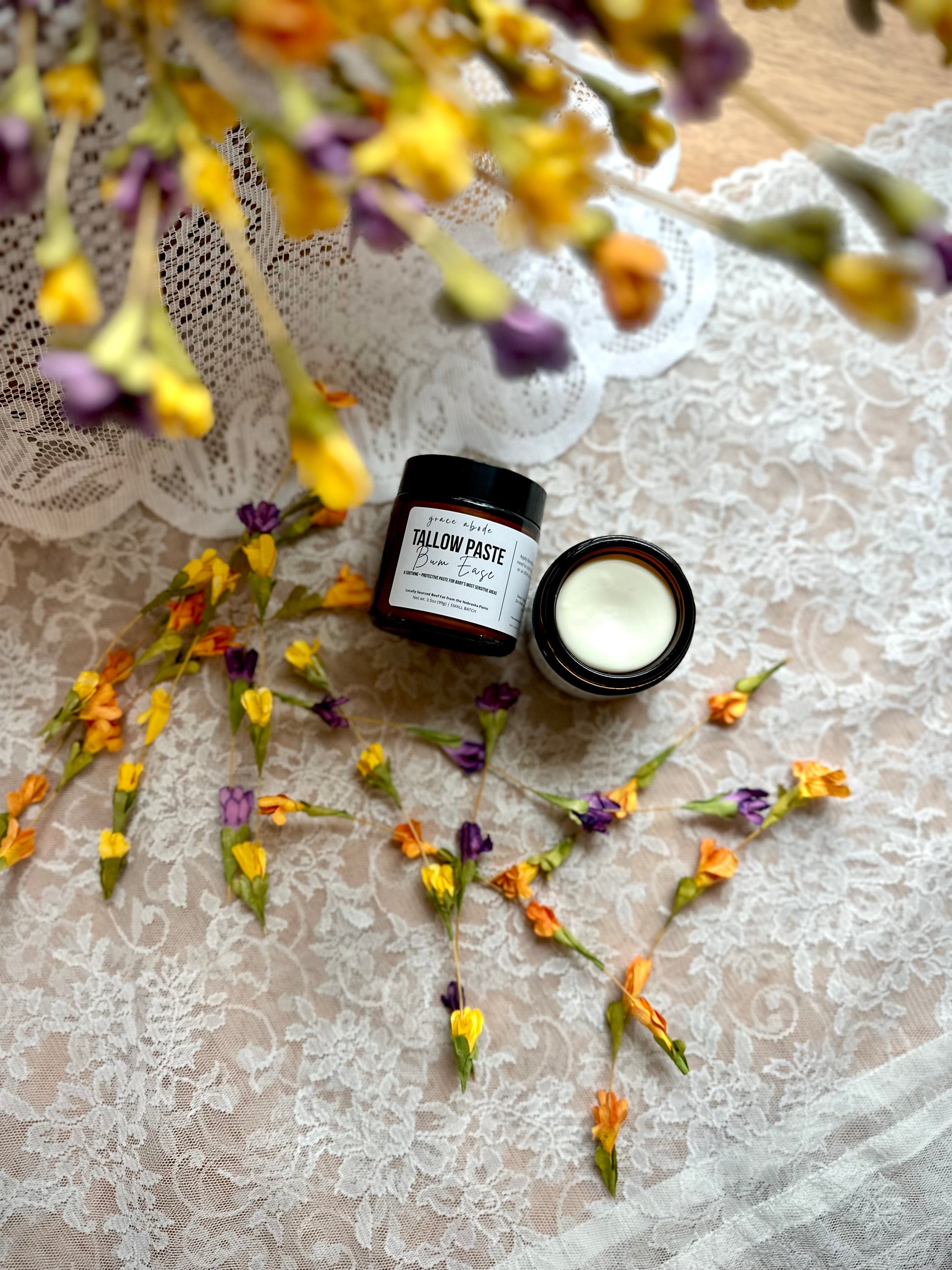 Formulated for your most precious little ones, Bum Ease is a thick, nutrient-dense tallow paste crafted to soothe irritation, create a breathable barrier, and help skin recover naturally and gently.