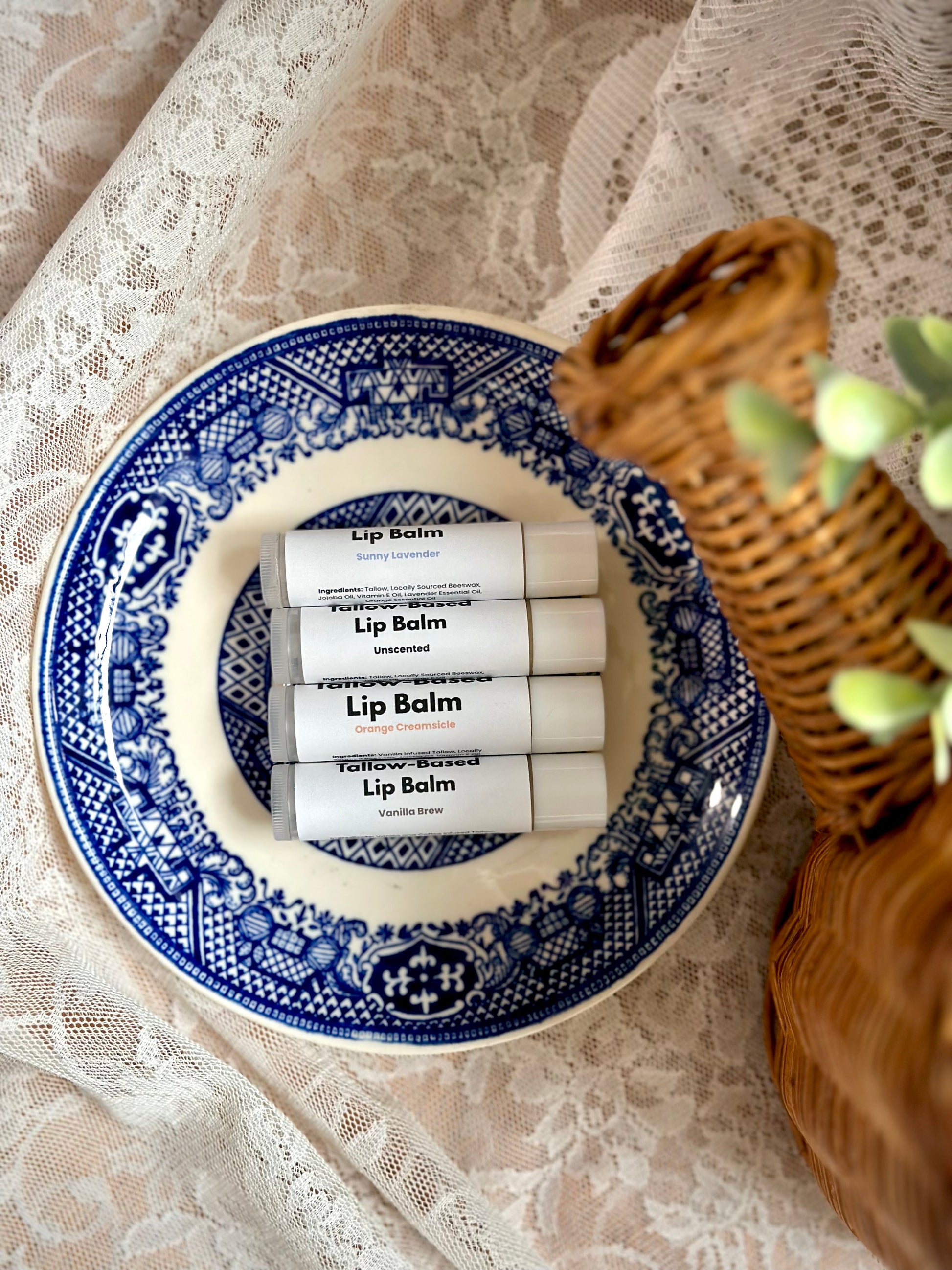 Each lip balm is handcrafted in small batches using a nourishing base of tallow, beeswax, castor oil, and vitamin E. The result is a rich, long-lasting balm that soothes and softens without any synthetic waxes, fragrances, or fillers.